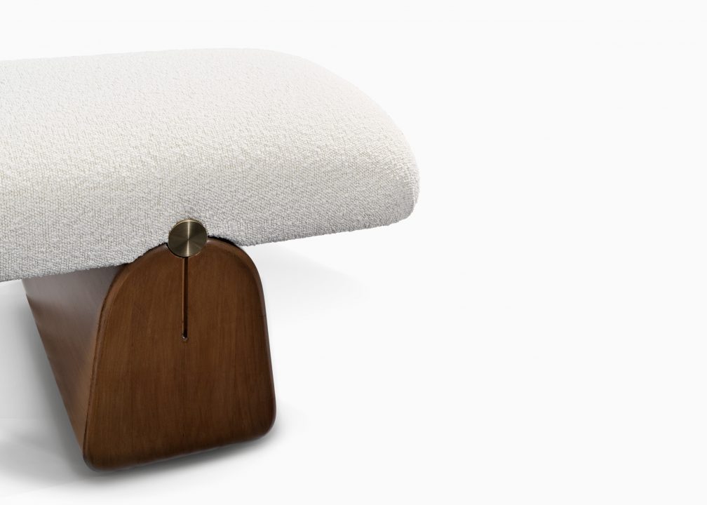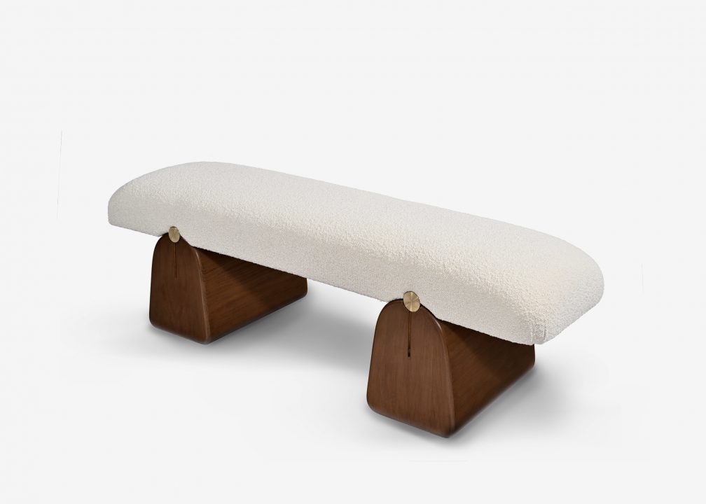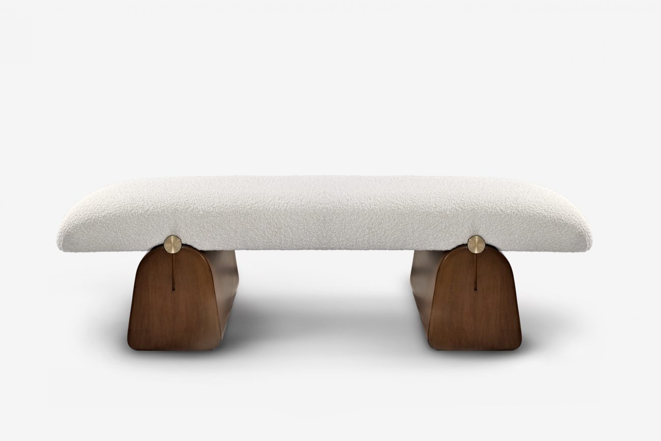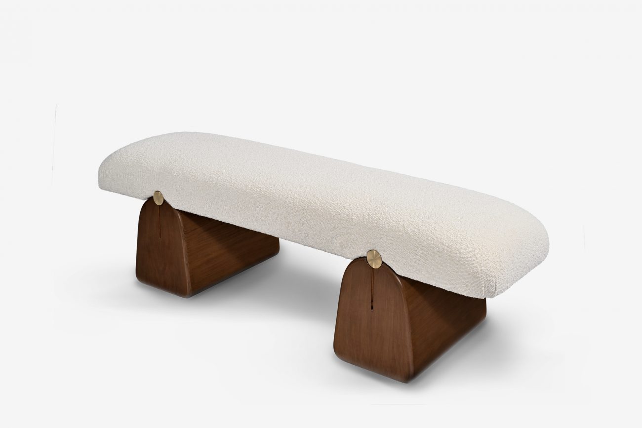Bouclé upholstered bench with hand-carved wood legs and patinated brass detailing